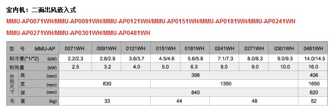 注:制冷:室內空氣溫度27℃干球/19℃濕球,室外空氣溫度35℃。制熱:室內空氣溫度20℃干球,室外空氣溫度7℃干球/6℃濕球。